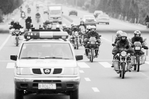 1月17日,交警在浙江衢州市常山县境内的国道上将大批江西籍骑行返乡过年的外来务工人员护送过境。