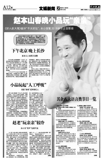 赵本山春晚小品玩“亲亲”《好人赵大海》被评“不太好玩”;本山吸氧20分钟才上台彩排下午北京 晚上长沙小品玩起“人工呼吸”