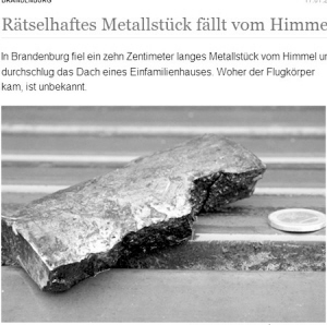 近日,德国勃兰登堡州哈维尔兰县(Havelland)出现一件怪事。一个10厘米长、5厘米宽、2厘米高的金属块从天而降,把一个民宅的屋顶砸出个窟窿。