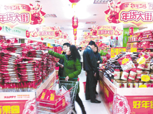 昨晚,在周口市区一大型购物中心,市民正选购年货。随着龙年春节临近,不论在超市、商场,随处都是购买年货的人流,卖场里洋溢着浓浓的喜庆气氛。晚报记者 朱海龙 摄