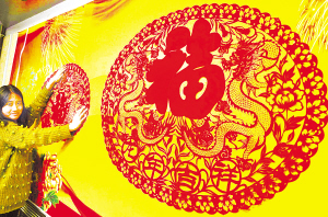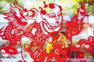 1月21日,一名妇女从江苏扬州市内一幅“龙元素”剪纸画旁经过。