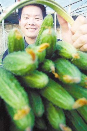 1月26日,农历正月初四。淮阳县城关镇贾庄行政村马庄村村民马伟国在蔬菜温室大棚里管理反季节无公害黄瓜。虽然室外天寒地冻,但马伟国的蔬菜温室大棚里却温暖如春,一派生机盎然的景象。