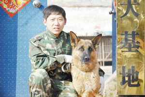 1月27日,农历正月初五,迎着远处村庄里噼里啪啦的鞭炮声,记者来到了淮阳县公安局警犬基地。记者通过县公安局很快就联系上了警犬驯导员徐奎,这个一眼看上去就很精干的小伙子还穿着一身迷彩服(下图)。徐奎说,这已经是他在基地陪同他的“战友”度过的第六个春节了。