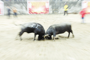 1月27日,在西南牛王争霸赛中,两头水牯牛在进行野牛组重量级比赛。