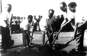 1965年7月1日,北京市领导彭真主持开工典礼,朱德、邓小平、罗瑞卿等出席。杨勇提出了地铁建设的三条原则,“地上服从地下,交通服从战备,时间服从质量”。79岁高龄的朱德元帅为地铁开工破土。