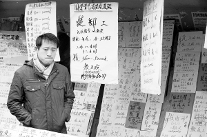 1月30日,青岛杭州路劳务市场,一名男子从众多的招聘广告前经过。