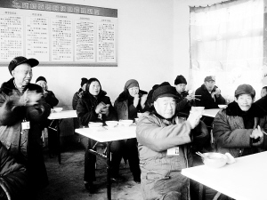 记者看到,老人当天的午饭是馍菜汤,菜是炖鸡块,每人都盛了满满的一碗(右图)。个别行动不方便的老人,则由管理员把饭菜盛好端到餐桌上。
