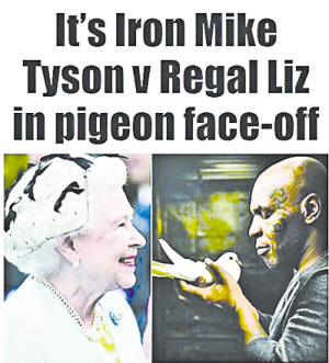 英女王要面对的对手之一,就是前重量级拳王泰森。泰森在拳台上残暴嗜血,生活中也是劣迹斑斑,但出人意料的是,他从小就喜爱鸽子。小时候在纽约的贫民区,泰森就省下自己的食物养鸽子,还因为宠物鸽被人弄死而第一次打架,从此混上了街头。在人生是非最多的时候,泰森一旦和鸽子在一起,都是最温柔、最平静的。即使破产之后,泰森也没有放弃对鸽子的喜爱,现在他家里养了3000余只鸽子。泰森对鸽子的特殊爱好甚至引起了美国探索频道《动物星球》栏目的关注。去年3月,这一栏目甚至专门制作了一档泰森参与的真人秀节目播出,内容就是让“赛鸽初学者”泰森和其他选手一起比赛。比赛内容是从几百公里外放飞各自的鸽子,然后计算鸽子返回家中的平均时速,时速快者为优胜,这档节目的名字叫《较量泰森》。