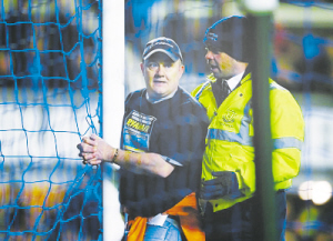 而英超频现这种闯入球场的闹剧,与英超球场的设计不无关系。英超球场绝大多数都是专用球场,没有跑道,在海瑟尔惨剧后也不像南美球场那样设安全隔离网,因此球场与观众席距离非常近,甚至有的相隔几米。在这样的情况下,安保防不胜防,球迷自然更容易闯进球场寻衅滋事,因此英超联盟需要考虑加强与改善安保。 (许 凯)