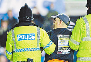 曼城客场与埃弗顿的比赛进行到上半场第40分钟,一位身着牛仔裤与黑色T恤、头戴一顶运动帽子的胖子球迷,突然突破球场安保的警戒与封锁,神不知鬼不觉闯入球场。只见他径直来到曼城球门柱旁边,居然将自己用手铐铐在球门柱上,双手环绕着门柱。闯入球场不为了裸奔作秀,不为了接近自己痛恨或喜爱的球员,也没有特意展示在T恤印制的一些宣传文字或广告,而是自己将自己铐在球门柱上,这在英超乃至整个足球界都是不多见的,而且这个用手铐自我“囚禁”的方法还相当有创意。