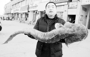 本报讯 常见的普通鲶鱼只有三四斤重。昨日,几名冬泳爱好者在沙颍河周口大闸上游遇到一场惊喜,他们徒手抓获一条“巨型” 鲶鱼。这条鲶鱼身长1米多,体重10余公斤,见到这条大鲶鱼的市民无不啧啧称奇。