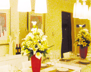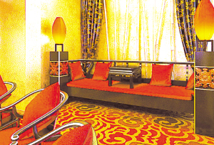 金箔墙漆和吊顶上的窗花造型奠定了东方风情的基调。首先,中式风格容易让人感到沉闷,所以选择红色的椅垫和抱枕,但是款式极其简洁,没有任何的装饰,颜色也不是大红,而是偏橙色的红,让整个空间增加现代感,在传统中让人感到放松,最妙的安排是两盏红纱落地灯,既渲染了节日的气氛,又在传统与现代当中找到了衔接点(如图一)。