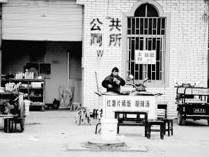 2月8日9时许,记者路过项城市客运中心站附近时,看到一所公厕门口,一摊主就地摆起了早点摊,卖红薯片稀饭、胡辣汤、油条和饮料。
