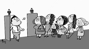 不知在女同胞的大声“通牒”之后,里面那些男士如何起身提裤急急走人狼狈而退;也不知那些本以为是自己领地的内急男士,面对“失地”如何“忍而无忍”。一场男女权界的战争在厕位争夺上爆发了,“好男不跟女斗”的男士会不会“人前君子人后小人”地在树丛中隐秘解决呢?