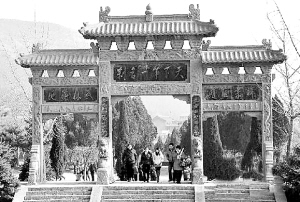 几位游客穿过嵩山少林景区内的石牌坊,准备前往少林寺参观(2012年1月31日摄)。自2011年底全国旅游景区质量等级评定委员会对嵩山少林景区下达了限期整改通知后,景区的旅游市场受到很大影响,今年1月份,景区游客人数和门票收入都有较大幅度的下滑。据登封市旅游局的一份统计数据显示,今年春节期间少林景区游客接待量为6.1万人次,比2011年同期下降了41.8%,门票收入则下降了13.7%。新华社发