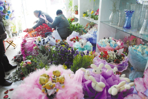 情人节到了,各式花束走俏。昨日,记者在市区八一路一家鲜花店看到,一束束色泽艳丽的各色玫瑰,一张张精心设计的活动宣传单,一个个忙着装扮花束的员工,为情人节当天购花潮做足充分的准备。 (实习生 段鹏/摄)