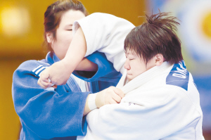 2月12日,中国选手秦茜(右)与韩国选手金娜英在决赛中较量。当日,秦茜在2012年女子柔道世界杯布达佩斯站78公斤以上级决赛中战胜韩国选手金娜英并获得金牌。中国选手陈飞获得70公斤级金牌。 新华社发(弗尔季·奥蒂洛摄)