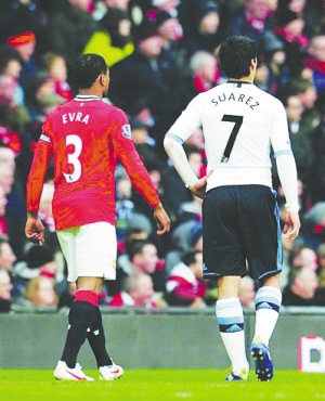 本报综合消息 英超第25轮焦点战,曼联主场2:1击败利物浦。比赛下半场开场仅5分钟鲁尼就梅开二度,第80分钟苏亚雷斯扳回一球。比赛前后,此前涉嫌种族歧视曼联队长埃弗拉的利物浦前锋苏亚雷斯,又制造了不少冲突,成为焦点。