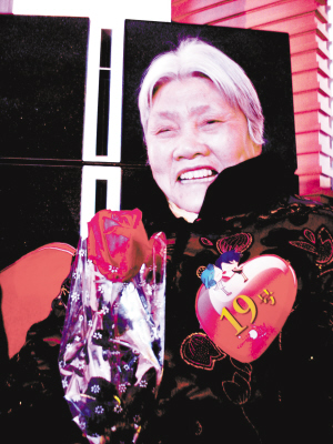 2月14日,项城市孙店镇的银婚老人周云香收到老伴刘建举送上的玫瑰花高兴地笑了(如图)。当日,项城市文广新局举办“相约情人节,爱就大声说”活动。现场,老中青三代“有情人”积极登台参与多种增进爱情的互动游戏。晚报记者 金月全 摄