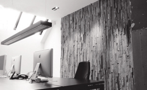 宽窄不一、长短不等、色泽不均的木条被有节奏地拼接在一起,成为一幅自然的浮雕,增加了墙面的纵深感。