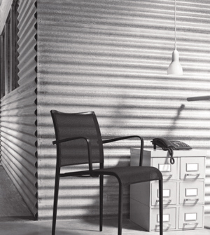 铁皮瓦楞板质地轻薄,是常用来搭建临时房屋的外部建筑材料,造价低,把它外材内用,包裹“屋中屋”是独具匠心的一笔,金属色泽和秩序感的波纹极具现代感。(李伟)