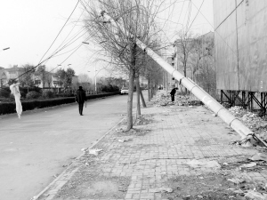昨天下午,记者在鹿邑县鸣鹿路北段看到,一根断裂的电线杆斜倚在路旁一棵树上,随时有倾倒的可能,十分危险。附近一位商贩说,这根电线杆是一周前被一辆货车撞断的,事发后,曾有人向有关部门反映,但不知什么原因,至今没有人前来查看。附近居民都希望有关部门能尽快将这根倾斜的电线杆挪走,消除安全隐患。