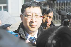 2月16日,被告人陆俊的辩护律师(中)在一审宣判后接受媒体采访。当日,辽宁省丹东市中级人民法院一审宣判一批涉足球系列犯罪案件。