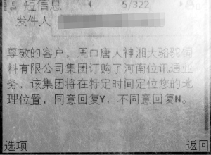 “当时公司给定位服务的员工发了一条信息,如果不立即回复同意,公司行政部就会打电话催促。”王鹏说,打电话也是命令的口吻。记者从王鹏手机上看到,接收定位信息是:“尊敬的客户,周口唐人神湘大骆驼饲料有限公司集团订购了河南位讯通业务,该集团将在特定时间定位您的地理位置,同意回复Y,不同意回复N。”