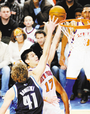 2月19日,尼克斯队球员林书豪在比赛中突破小牛队球员诺维茨基的防守上篮。当日,在2011-2012赛季NBA常规赛中,纽约尼克斯队主场以104比97战胜达拉斯小牛队,尼克斯队华裔球员林书豪拿下28分和个人职业生涯新高的14次助攻。新华社记者 申宏 摄