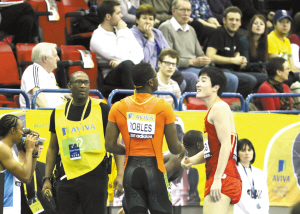 2月18日,罗伯斯(中)祝贺刘翔(右)夺冠。
