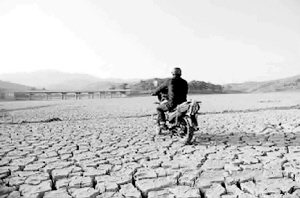 2月19日,记者途经石林县新坝水库时看到,这里已经完全干枯,龟裂的地面已经变得十分坚硬,有的地方可以骑摩托车通过。