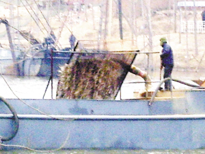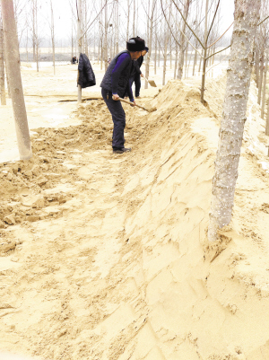 约16时半,在一处砂场附近,记者看到两位老师傅正用砂子堆起矮矮的砂墙。询问得知,他们这叫做“打水圈”,是为了抽砂时砂水不四处流淌。记者佯装是买砂的,问其中一位师傅:“你们的砂子多少钱一方?”“50元一方。”“你们怎么白天不抽砂子呀?”“刚才还在抽,不知怎的,又让停了。白天水政监察人员查,老板们都很谨慎,他们都是晚上抽。我们白天为老板‘打水圈’。天黑之后,老板有专门的工人负责抽砂,等到第二天,我们再来打水圈,过不了几天,一大垛砂子就抽好了。”