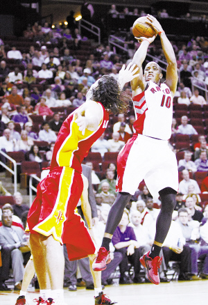 2月28日,火箭队球员斯科拉(左)在比赛中防守猛龙队球员德罗赞的投篮。当日,在2011-2012赛季NBA常规赛比赛中,休斯敦火箭队主场以88比85战胜多伦多猛龙队。新华社发(宋穹摄)