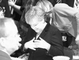 本报综合消息 据德国《图片报》、英国《太阳报》等2月27日报道,德国女总理安吉拉·默克尔上周在出席执政党“基督教民主党”大会时,遭遇尴尬一幕:一名年轻的酒保在上酒时,一个趔趄将手中托盘上的4杯冰啤一股脑儿地泼洒到了这位“欧洲最强势女人”的后脖子上。有现场与会者将这戏剧性的一幕用手机录下之后,又有好事者将视频上传到网上,一时间大热。值得一提的是,惨遭“偷袭”的默克尔虽然被淋了个“透心凉”,可是她只是耸了耸肩、微微一笑,很快便恢复了淡定。“铁娘子”的从容表现让她的亲民指数一夜飙升!