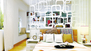 解决方案:将两个房间的间隔墙打通,两个飘窗透过来的光融合一起,整个空间的采光一下子就亮堂了;利用原来的横梁位设计半隔断的屏风,一边做书房,一边做主人房,无论从哪一边看去,整个房间都显得很大,屏风也暗藏“玄机”,上半部分是半通透的几何造型,下面则是一排储物柜,隔断的同时兼有实用功能(图3)。