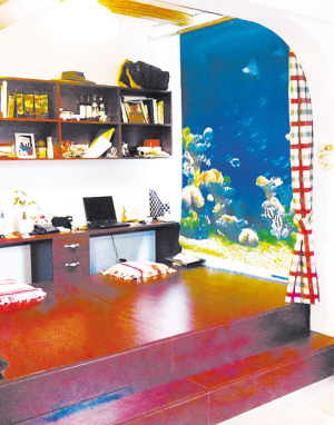 解决方案:根据这个梁位的位置和造型,在里面设计了一个书房,为了使书房也能临时充当客房,设计成了日式榻榻米。但是中国人并不习惯长时间坐在地板,所以在榻榻米和墙壁之间留出了一些位置,坐下来时双脚可以垂下来。而 榻榻米下面可以储物,但是要做好防潮、防虫。