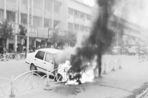 当日10时56分,太康县消防大队官兵接到报警,称一辆白色小轿车在该县建设路建业广场东北侧起火(如图)。消防大队官兵赶到现场,发现起火车辆地处闹市,交通拥堵,消防车辆无法达到火场。为此,消防大队指挥员紧急命令一名消防战士携带灭火器先行到达现场压制火势,同时命令其他消防战士到起火现场附近的宾馆,利用宾馆内的消火栓灭火。通过消防官兵和现场群众的共同努力,大火被迅速扑灭。
