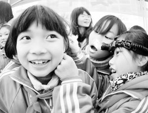 3月1日,钦州市子材小学的小学生在相互体验、学习保护耳健康知识。