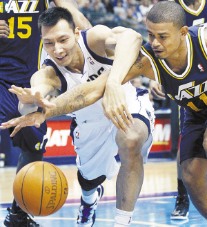 3月3日,小牛队球员易建联(左)和爵士队球员沃森在比赛中拼抢。当日,在2011-2012赛季NBA常规赛中,达拉斯小牛队主场以102比96战胜犹他爵士队。