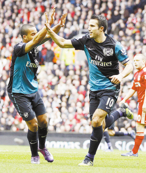 3月3日,阿森纳队球员范佩西(右)与队友沃尔科特庆祝进球。当日,在2011/12赛季英格兰足球超级联赛第27轮的比赛中,阿森纳队客场以2比1战胜利物浦队。
