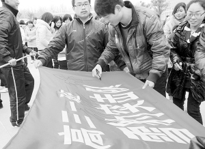 2月25日,鹿邑县三高召开2012届决战高考百日冲刺誓师大会,1000余名师生参会。三高校长高光乾向全体师生提出殷切的希望,勉励同学们树立必胜信念,发扬拼搏精神,以良好的心态迎接高考的挑战与洗礼,并寄语三高再创高考辉煌。会后,师生们进行了高考百日倒计时揭牌活动,全体高三学生积极参加了誓师签名活动。图为同学们在进行誓师签名活动。(沈力 摄)