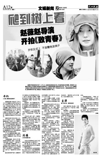 赵薇当导演的新戏开拍了!3月3日,这条消息被热烈地讨论,并迅速传遍论坛和微博。筹备数年,赵薇的导演处女作《致我们终将逝去的青春》(以下简称《致青春》)选择在南京开机。当日上午10点,赵薇携主演赵又廷等主创在南京医科大学五台山校区篮球场上举行了简单的开机仪式,现场被围观的学生、粉丝、媒体围得水泄不通,有影迷为了看赵薇,甚至爬到了树上。