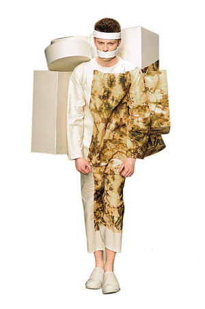 日前,有一条名为“谁要穿成这样,我一巴掌扇他”的微博在网络上大量转发,内容是几张男模走秀图,只见男模服装的垫肩又高又宽,不仅脖子都挡住,两片宽垫肩看上去就像两块木板。看完无需“鸡冻”,要知道,在全球范围内,特别是顶级时装周上,这类惊悚代表绝对不是少数。例如金发“橡胶小姐”再次征战时装周。这位姑娘一身胶衣,抱着标志性的橡胶狗玩具,就连面目都是一副橡胶样,很难不让人想起情趣店里的橡胶娃娃。