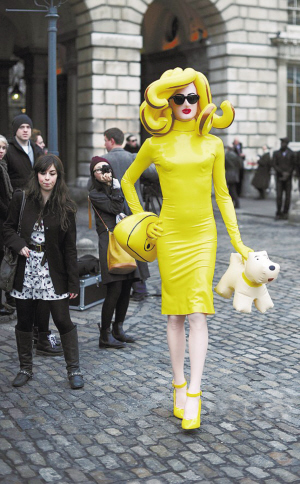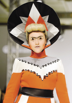 出位之战在T台上更激烈。在Sister by Sibling品牌秀场中,模特头戴色彩斑斓的头套出现,头套上还要装上两朵硕大的花朵,估计模特自己都觉得没面目见人。当然,大家都知道,许多独特个性的设计往往只是代表了某种设计潮流,并不一定出现在现实生活中,它仅仅是对未来发展趋势的一种预计而已,就像车展上的概念车一样,量产又是另一款模样。但T台上的概念有时候真是让人哭笑不得。例如在伦敦2012年秋冬时装周,Pam Hogg专场秀。英国著名男演员雷·温斯通(Ray Winstone)之女杰美·温斯顿(Jaime Winstone)为Pam Hogg走秀。穿上红、白、灰、黑四色构成的几何图案裙,头戴“灯罩”,搭配一字眉妆容,这不是活生生抢周星驰饭碗吗。