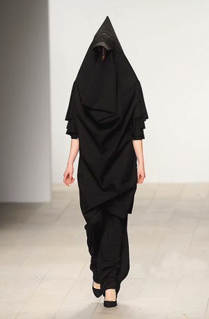 好吧,如果我认为这不是时尚,你会说我是土人,那我就坚持我的土人身份。起码看了Central Saint Martins MA品牌的作品,我更愿意做一枚土人。无论是谁,看到这头戴黑色尖高帽,黑色面纱遮脸,及脚黑色长纱裙的造型时,一定会想起可怕的黑无常吧。吓死个人了。(刘佳宁)