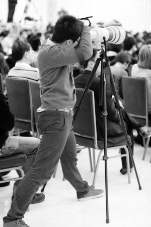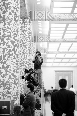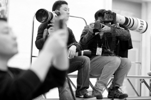 3月6日,十一届全国人大五次会议举行记者会,外交部部长杨洁篪答记者问。这是现场记者在工作。新华社发