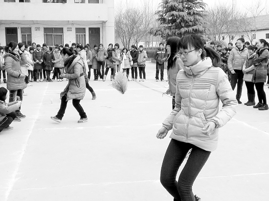 3月8日,为庆祝“三八国际劳动妇女节”,丰富女教师课余文化生活,倡导快乐运动的健康理念,商水县练集镇中心校举行了庆“三八”女教师跳绳、踢毽子比赛。整个比赛过程欢快热闹,激烈活泼,充分展示了该校女教师良好的精神状态和积极向上的精神面貌。(张磊 摄)