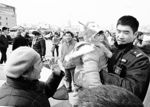3月11日12时30分许,淮河摄影网采风团两名摄影师在淮阳羲皇文化广场发现一名哭闹的女童。经询问,两名摄影师得知孩子与家长走散了。于是,这两名摄影师和几名群众一起将孩子交给了在广场值勤的民警许炎(如图)。