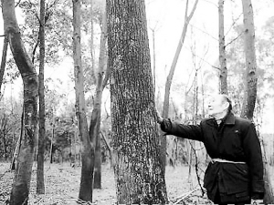 “这是40年前我种下的第一批树,现在都长这么大了。”91岁的漆友朋摸着粗壮的樟树,欣慰无比(如图)。40年里,老人种下了57万多棵树木。