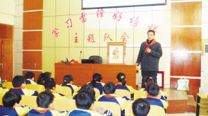 昨日上午,在周口市第一实验小学礼堂,学生用热烈的掌声迎接孙永清老师,并为他送上鲜花、系上红领巾。孙永清老师用图文并茂的形式为学生讲述了雷锋的动人事迹(如图)。